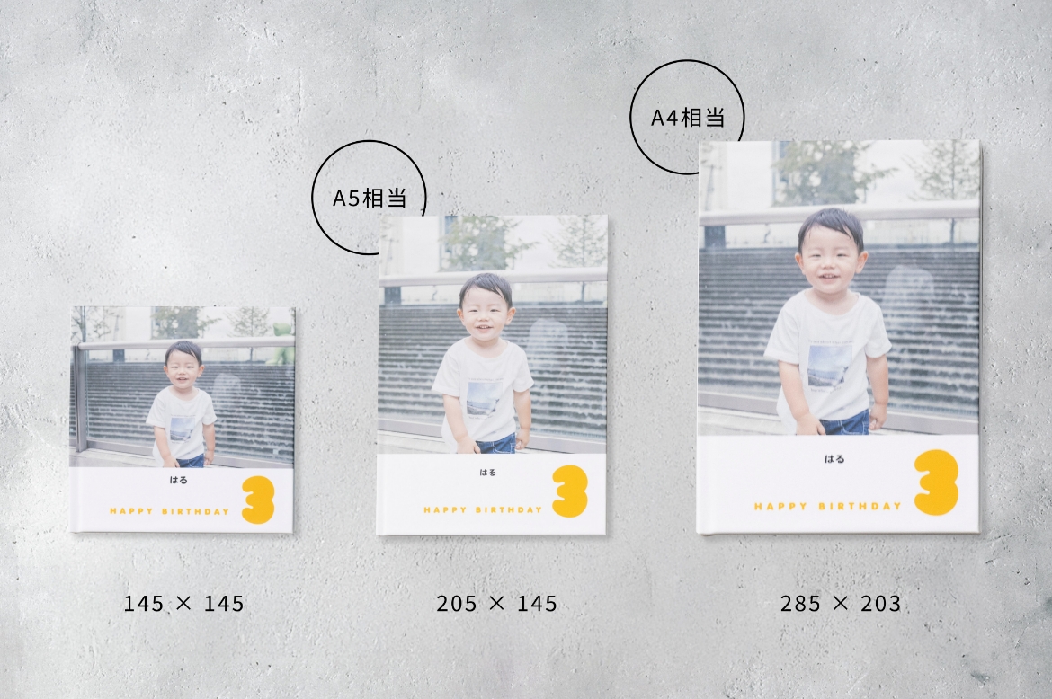 ハードカバータイプは3種のサイズとページ数から選択可能。お好みのフォトブックをお作りいただけます。