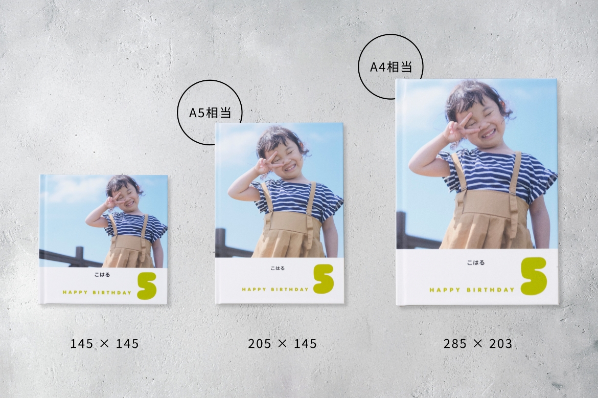 ハードカバータイプは3種のサイズとページ数から選択可能。お好みのフォトブックをお作りいただけます。