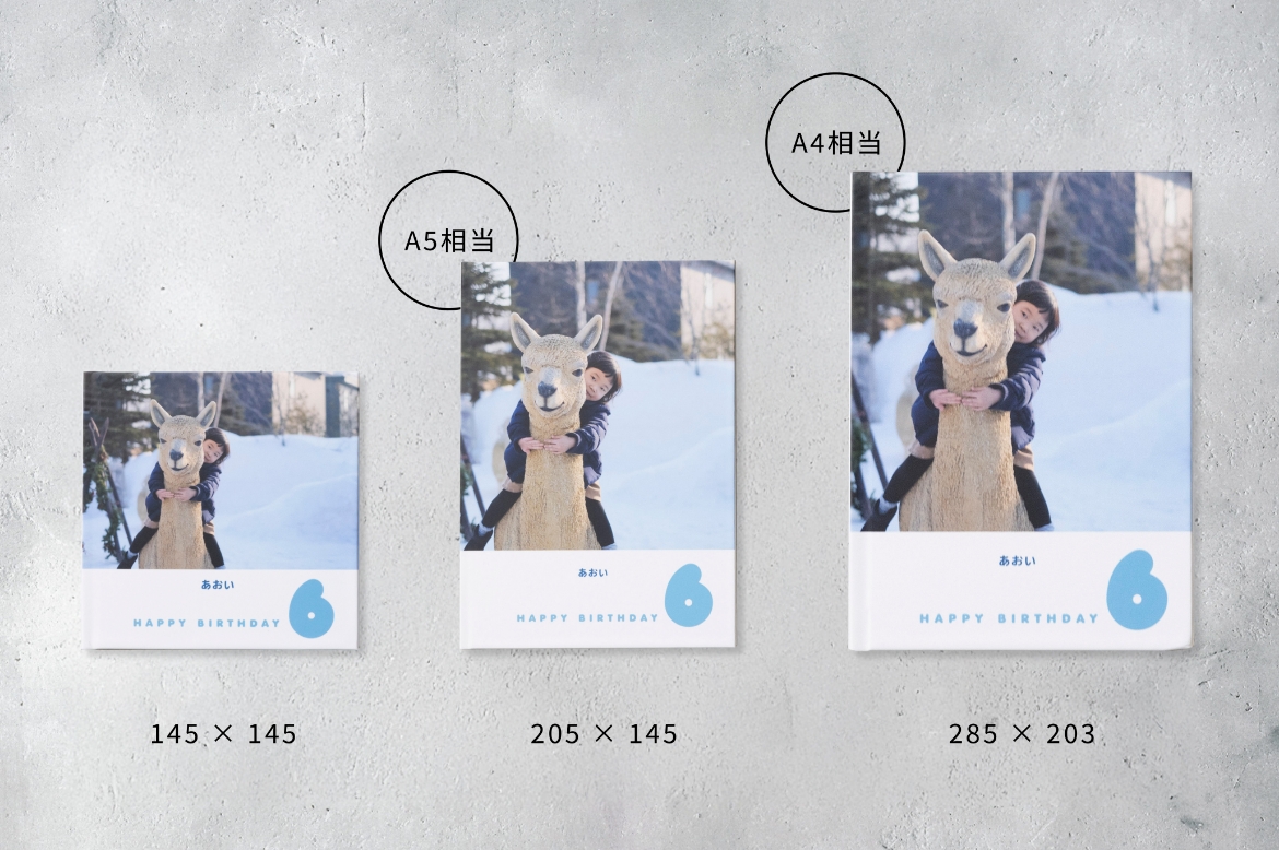 ハードカバータイプは3種のサイズとページ数から選択可能。お好みのフォトブックをお作りいただけます。